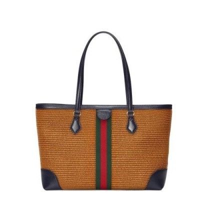 GUCCI/古驰 中号驼色稻草编织蓝色皮革饰边红绿条纹装饰单肩手提包